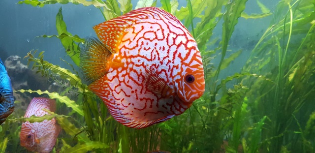 Discus fish breed are a popular freshwater aquarium variety. Very clam moving behaviour. They have bright colour and distinctive shape.