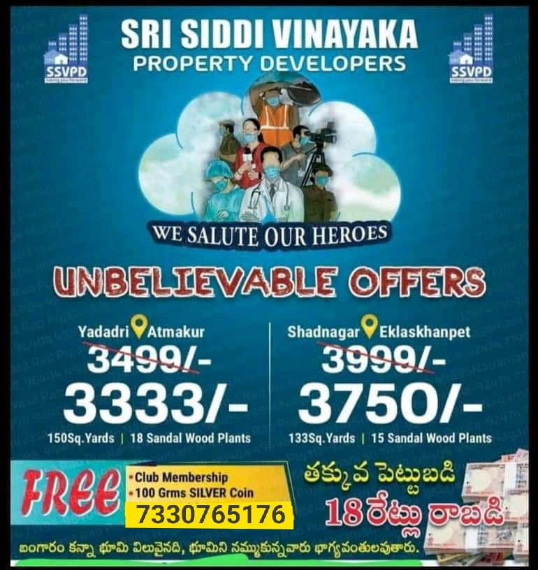 Note:లక్ష డౌన్ పేమెంట్ చేసిన వారికీ ప్రతి 150 గజాల కొనుగోలుకి 100 గ్రాముల వెండి నాణెం ఉచితంగ ఇవ్వబడును( pre launch offer కొన్ని రోజుకు మాత్రమే)